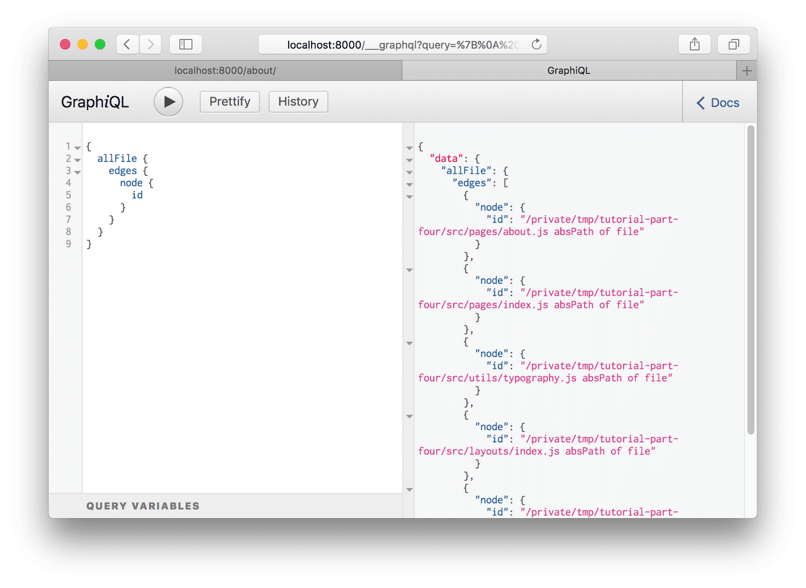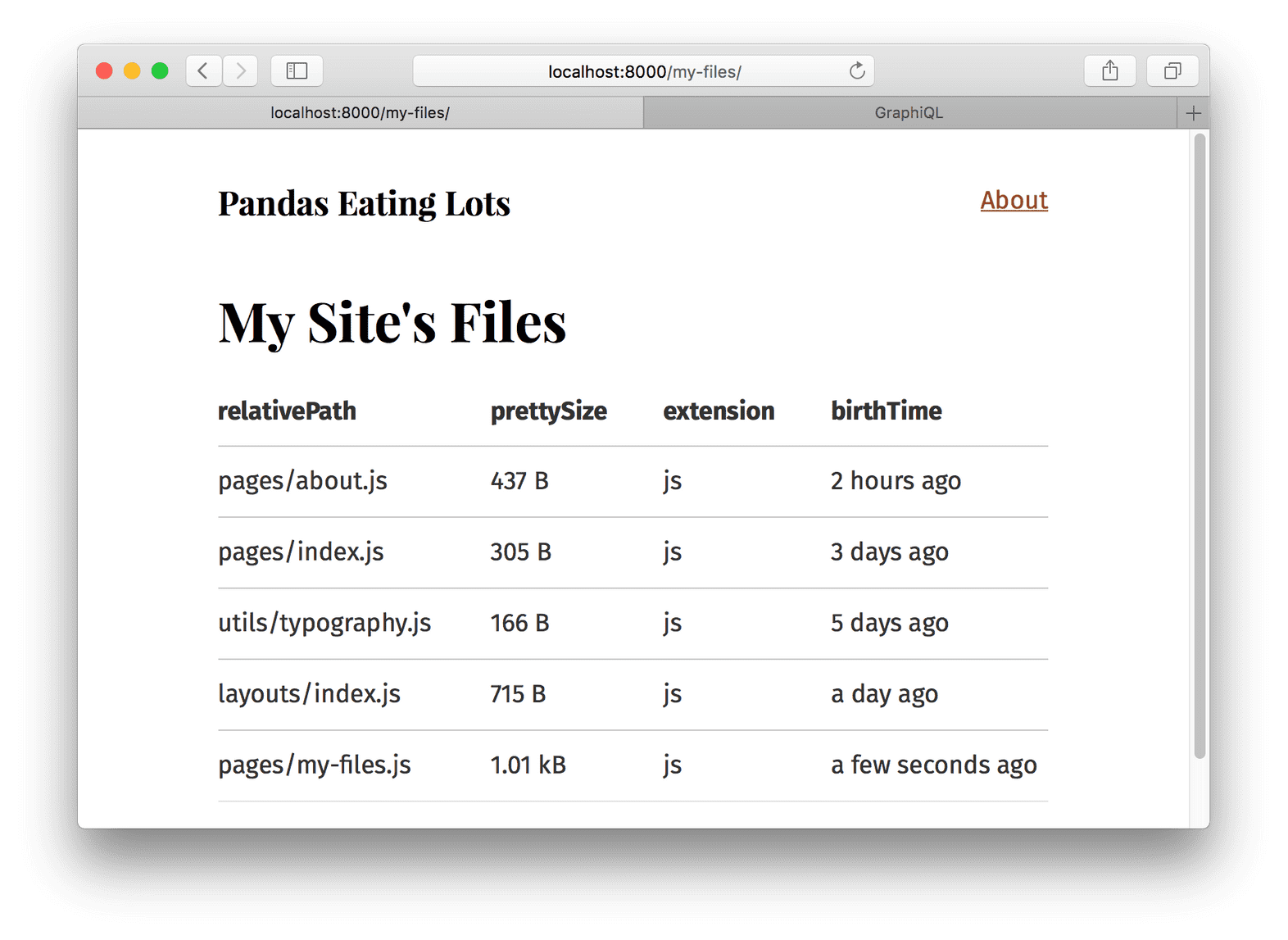 결과는 파일 "nodes"(node는 "graph" 내부 객체의 fancy한 이름!) 의 목록이다. 각각의 파일 객체는 당신이 쿼리했던 필드들이 있다.