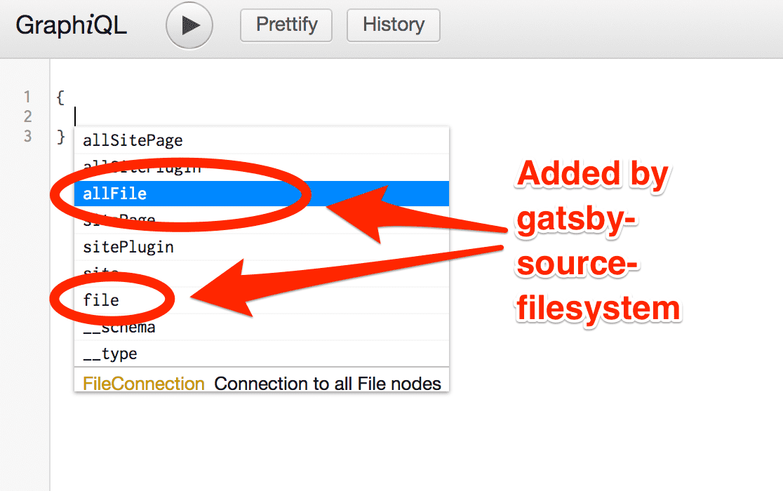 자동 완성 팝업을 띄우면, gatsby-source-filesystem이 추가한 allFile과 file을 보게 될 것이다.