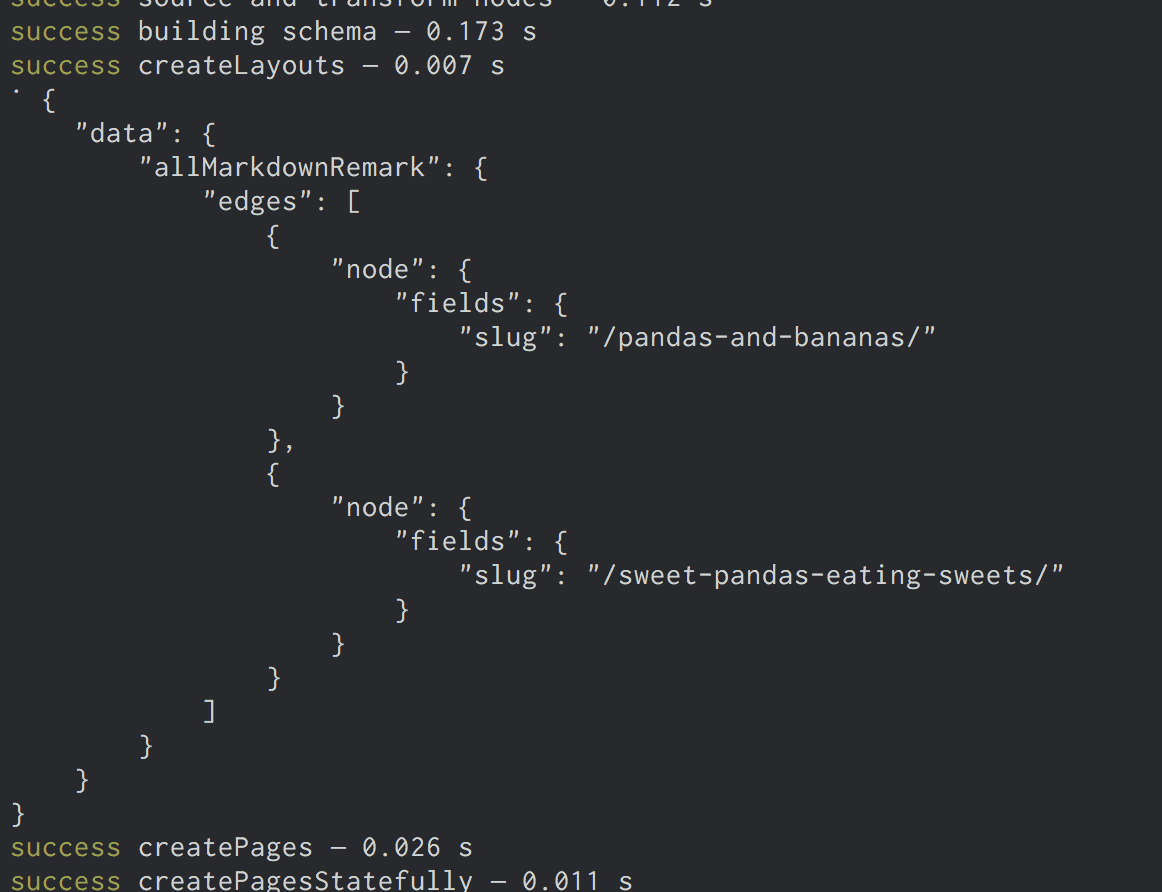 생성했던 마크다운 slug를 질의하기 위해 제공된 graphql 함수를 사용했던 것은 마크다운 파일로부터 페이지를 생성하기 위한 첫번째 단계이다. 그리고 질의문의 결과 로그는 이것처럼 보여야 한다: